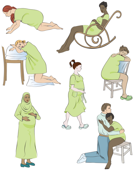 • هذه بعض الأوضاع قد تساعدك أثناء المخاض.كلما تحركت أكثر وأرجحت منطقة الورك كلما أصبحت حركةالطفل إلى أسفل أسهل وتتقدم الولادة.
